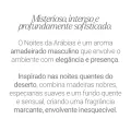 O Noites da Arábias é um aroma amadeirado masculino que envolve o ambiente com elegância e presença. Inspirado nas noites quentes do deserto, combina madeiras nobres, especiarias suaves e um fundo quente e sensual, criando uma fragrância marcante, envolvente inesquecível.
